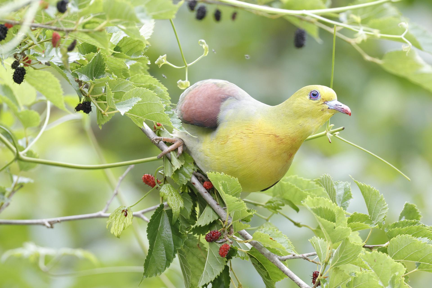 ※ヤマグワの実を食べて嘴の先が赤くなったアオバト Photo by Kazuhiro Sasa