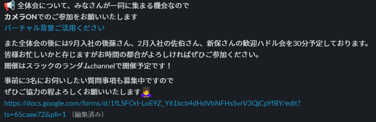 色々な質問やちょっとしたトピックを共有することでみなさんの人となりを知ることができましたし、他部署の方と話す機会になって助かりました。