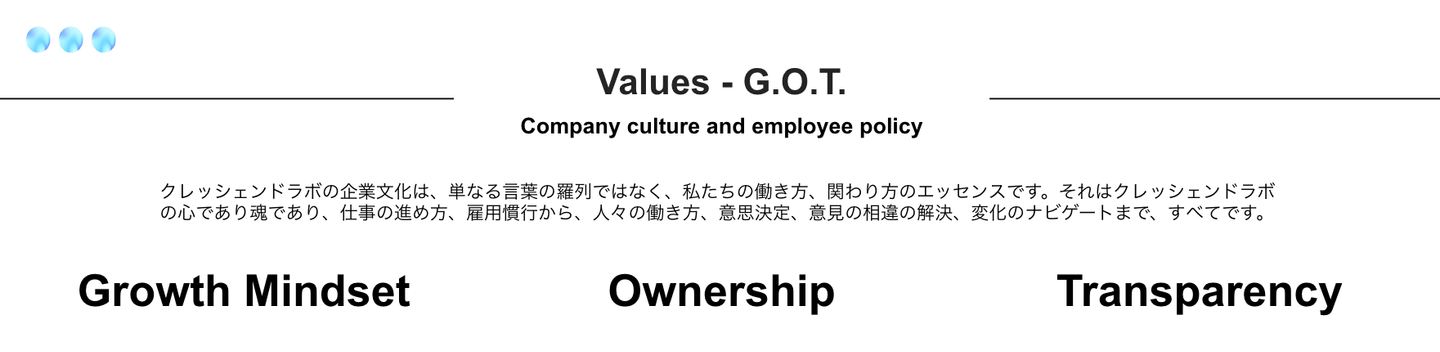 次に、弊社が大切にしている価値観をご紹介します。「Growth Mindset」「Ownership」「Transparency」の3点で、それぞれの頭文字をとって「G.O.T.」と呼んでいます。
