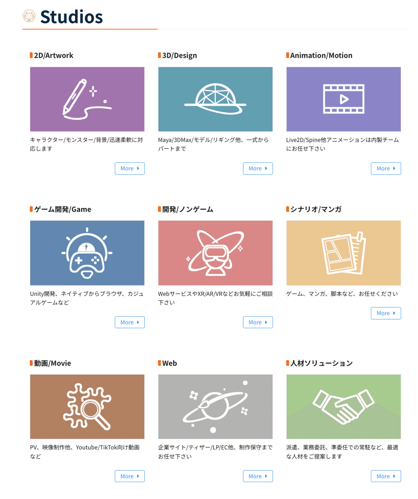 事業領域も複数あり、それぞれの中で扱うジャンルや案件の種類も非常に幅広いです。例えば、イラスト一つとってもSD系からリアル系までありますし、ゲームではハイパーカジュアルゲームから、作り込みが求められるコンシューマゲームまで手掛けています。