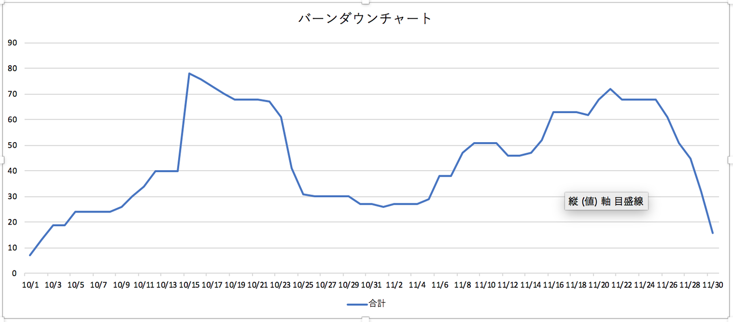 例えば...とある案件のバーンダウンチャートはこちら。山が2つあるのはフェーズが別れているからです。