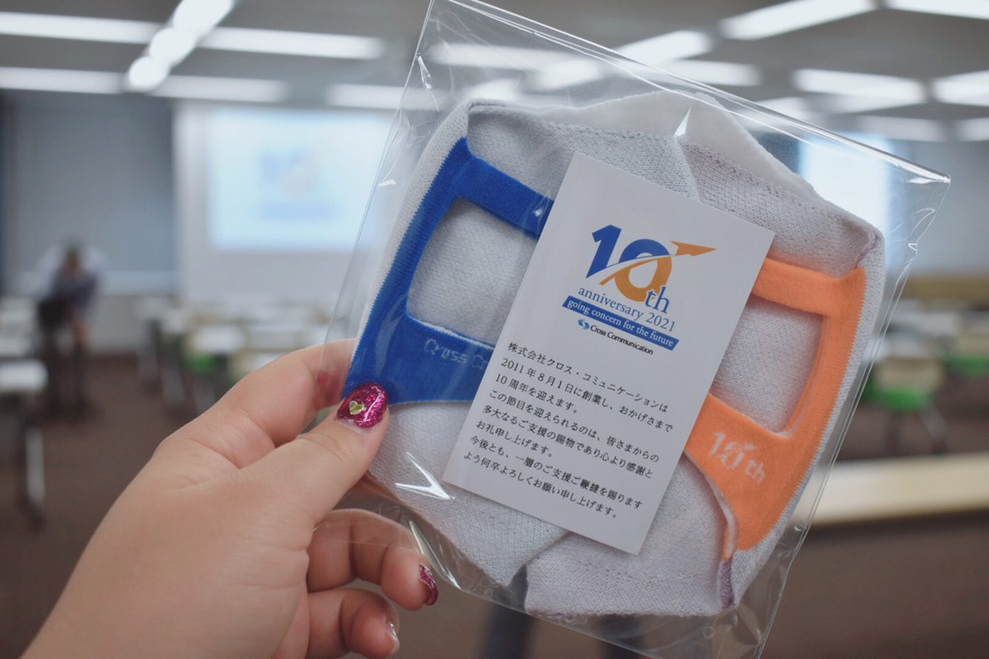 その中で、富永社長より従業員の皆様に感謝の気持ちを込めて、10周年記念オリジナルマスクを配布させていただきました。