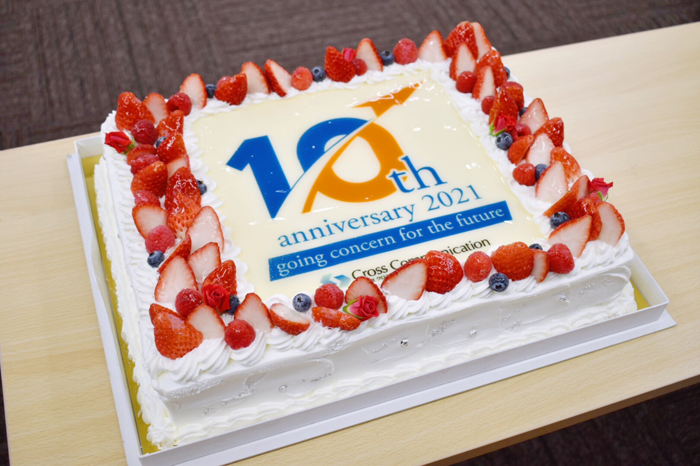 新卒の3名が30×40センチのケーキを運んできてくれた時、社員のみなさんの顔がほころびました。ささやかですが10周年のお祝いができたかなぁと思います。