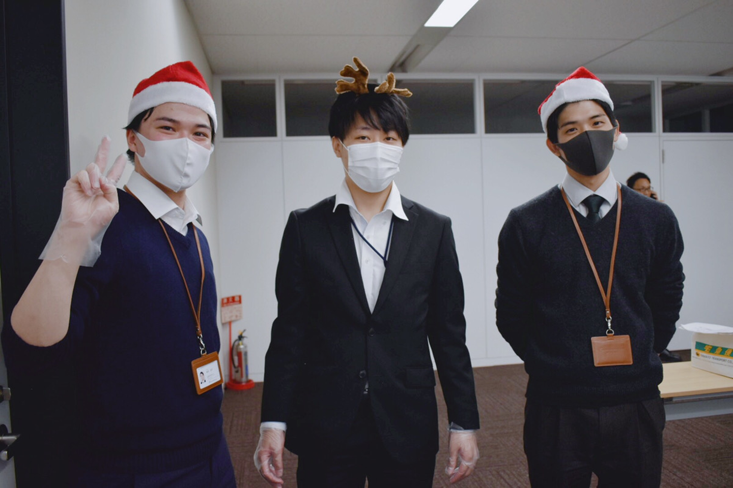 └納会のお手伝いを頂いた新卒3名の皆様、ありがとう!サンタ帽とトナカイの角がお似合いです。