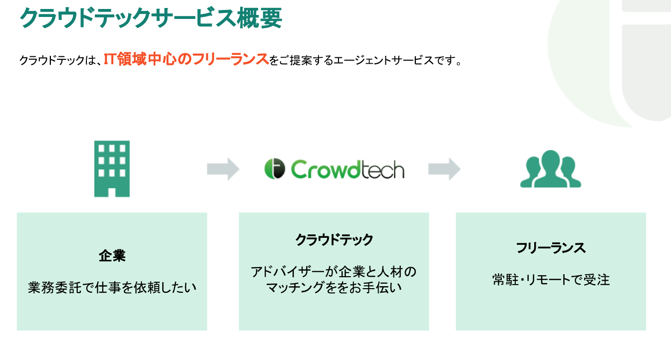 ひとことでお伝えすると、クラウドテックは「フリーランスのマッチングエージェントサービス」を提供しています。