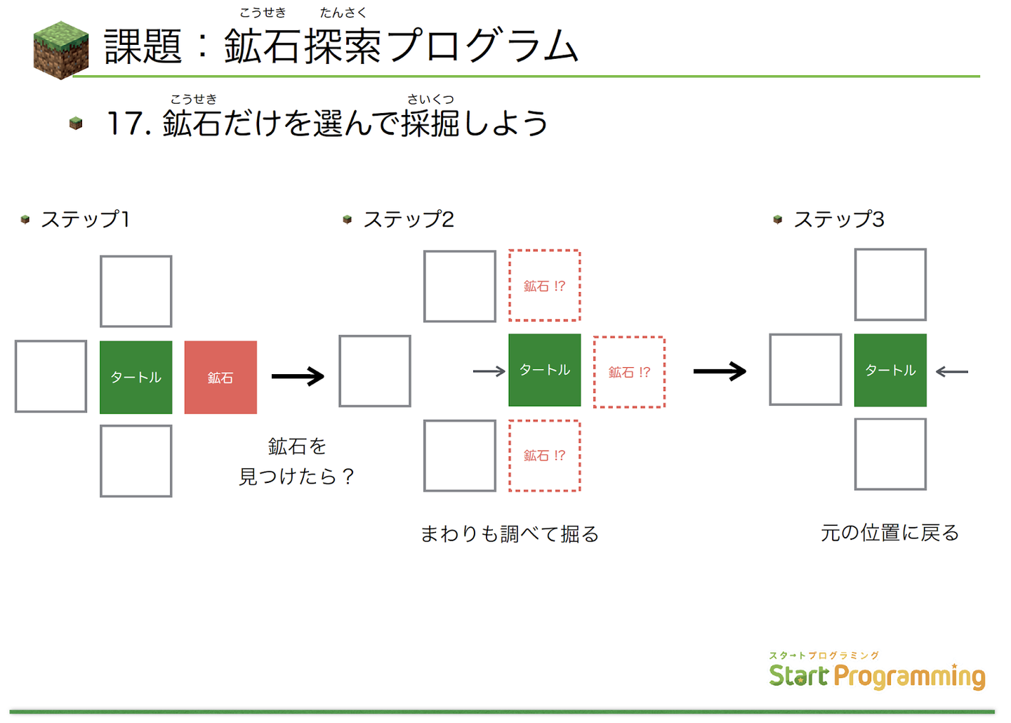 『マインクラフト』では、実際にコードをタイピングしてもらいながら学習をおこないます。