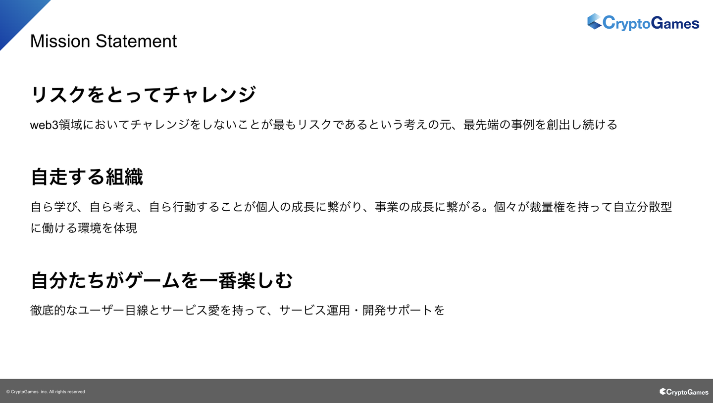 前例が無いこと、難しいことにもチャレンジしていく、そこに楽しさを見出している人がCryptoGamesには沢山いますね。