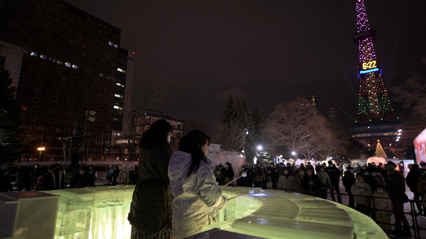 会場には氷のマリンバとティンパニを設置。感圧センサーが埋め込まれた62種類の音板を叩くと、札幌のランドマークである「さっぽろテレビ塔」や周囲の電飾がリアルタイムで連動して光る空間を創り上げました。筆者は実際に氷の楽器を演奏する機会があったのですが、自分の音に合わせてあのテレビ塔が色を変える様は、なかなか感動的で貴重な体験でした!