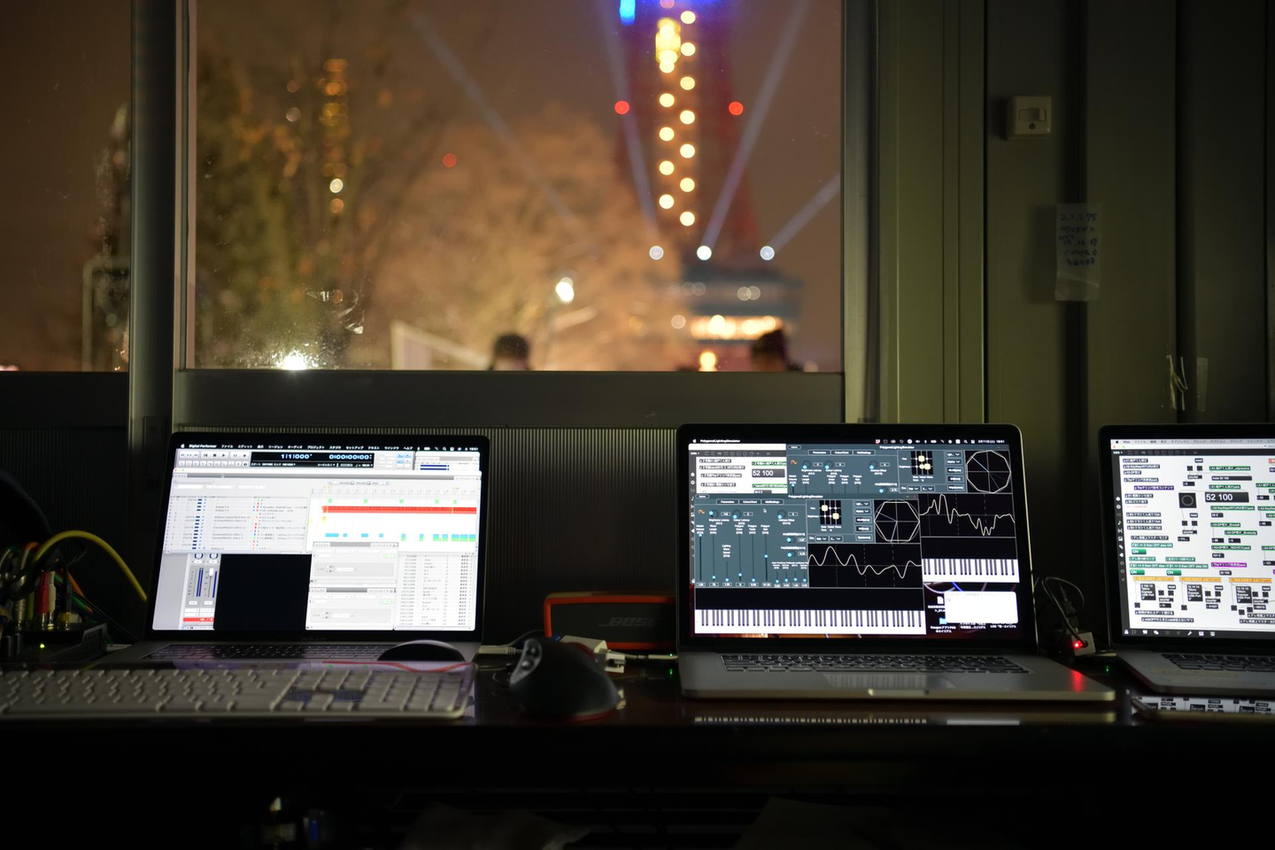ちなみに、氷の楽器と雪像の近くに用意された作業小屋では、屋外の演出の邪魔にならないよう、技術スタッフが室内灯OFFの状態でシステムの作動を静かに見守っておりました。