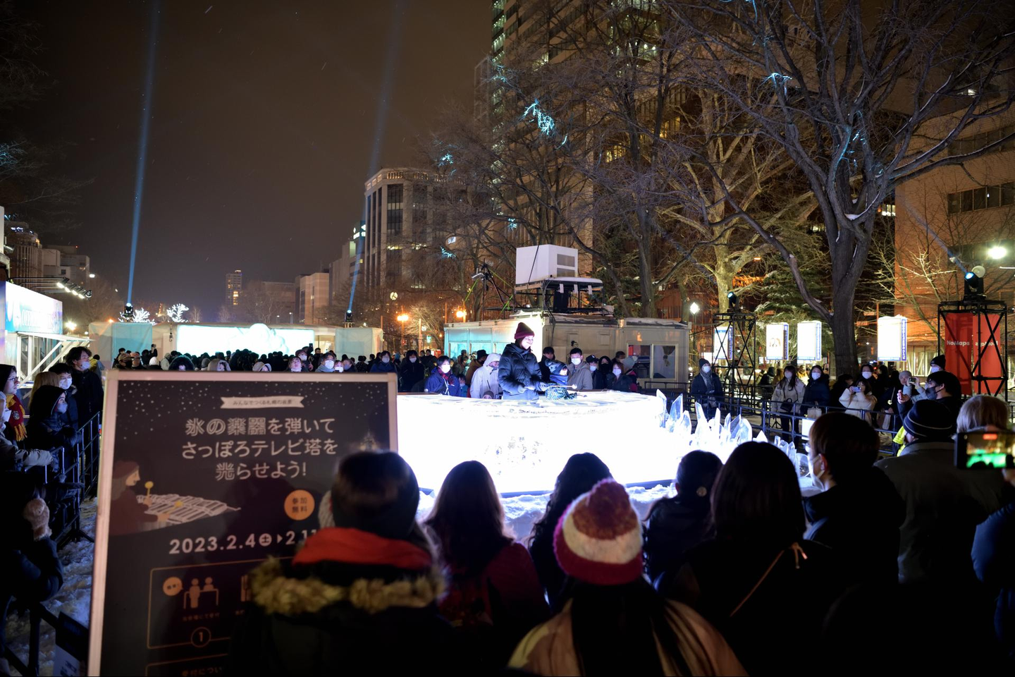 今回の実証実験は、北海道を舞台にテクノロジー・エンタメ・クリエイティブを中心としたフェスを開催している「NoMaps」(当社も運営で参画)と、「第73回さっぽろ雪まつり」のコラボレーションで実現。雪まつりにお越しの一般の方に参加いただける体験型イベント「みんなでつくる札幌の夜景!氷の楽器を弾いてさっぽろテレビ塔を光らせよう!」を、大通会場2丁目で連日開催しておりました。