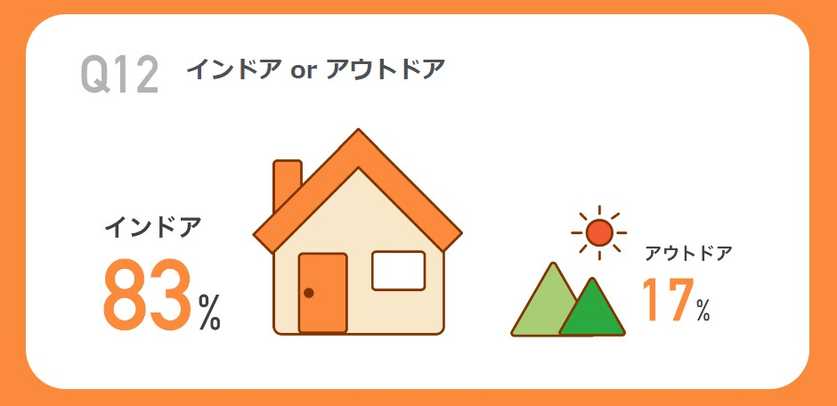 最も特徴的なデータは「インドア or アウトドア」でしょうか。8割がインドア派と回答しております。アクティ部の今後の活動に期待です!