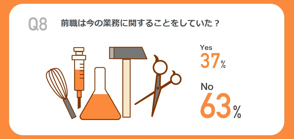 「前職は今の業務に関することをしていた?」も6割がNOという結果になっており、異業種転職の多さが目立っています。前職が別商材の営業、アパレル店員、自衛隊、ライブハウススタッフなどなど個性あふれる経歴を持つ社員が多数在籍しております。