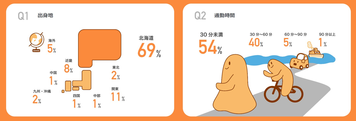 当社の所在地は北海道札幌市です。エンジニアについてはフルリモート勤務での採用を2020年より取り入れましたが、出社できる範囲に住んでいる人がほとんどです。そのような背景もあり、北海道出身者が約7割となっています。最近ではフランス・中国・タイといった海外出身のメンバーも増えてきました。関東・関西をメインに道外からの入社も新卒を中心に増えており、北海道の好きなところについては「適度な都会感が好き!」「満員電車が耐えられる範囲内で嬉しい!」といった回答がありました。