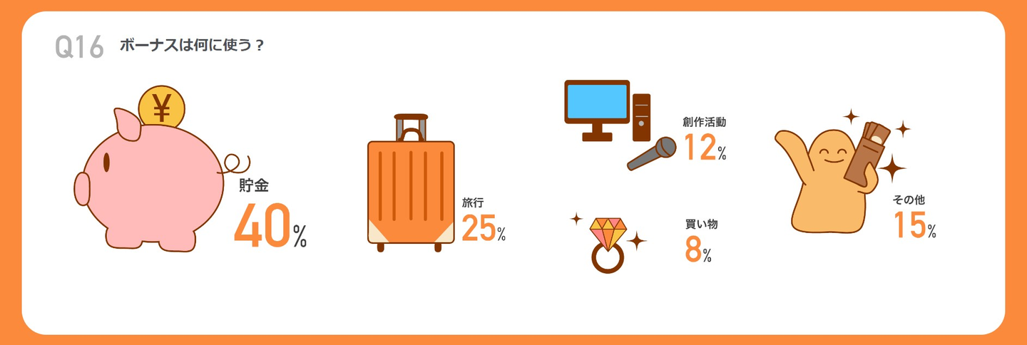 当社ははじめ契約社員として入社いただき、その後お互いのイメージが合致したのち正社員登用をする採用スタイルとしております。正社員登用後には個人の成績・会社の業績によってボーナスが支給されます。ボーナスの使い道としては。インドア派が多いこともあり貯金が1位となりましたが、創作活動やその他の回答の中には「推し活」など、当社らしい回答もありました!