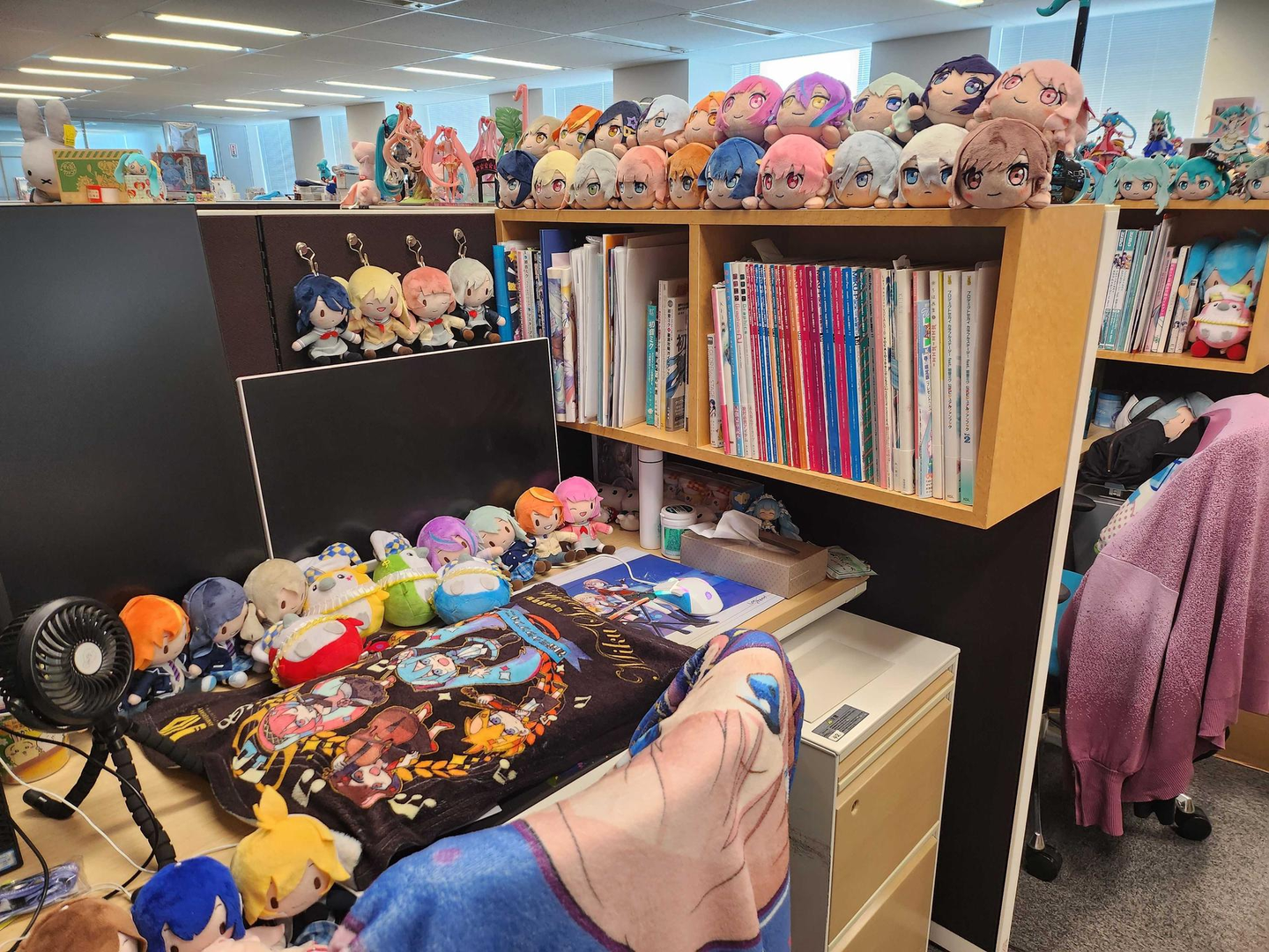 ちなみに、デスクについては個々に仕切りが深く設けられ、業務に集中しやすい環境となっております。初音ミクたちピアプロキャラクターズのグッズや趣味のものなど、各々テンションが上がるようなデスクに仕上がっております。