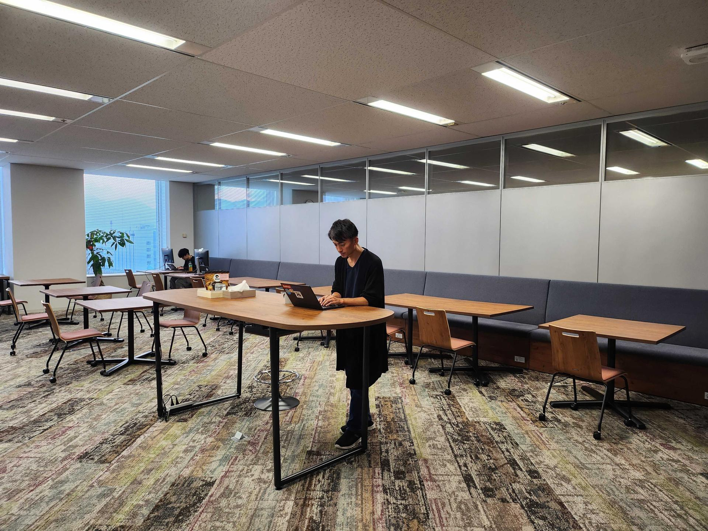 こちらのカフェスペースは休憩時間に限らず、業務を行なう場所として使用することも可能です。オープンスペースで、他チームのメンバーとも会話を交わす機会が増えました。立ってお仕事が出来る場所もでき、健康面に効果を感じている方もいます。