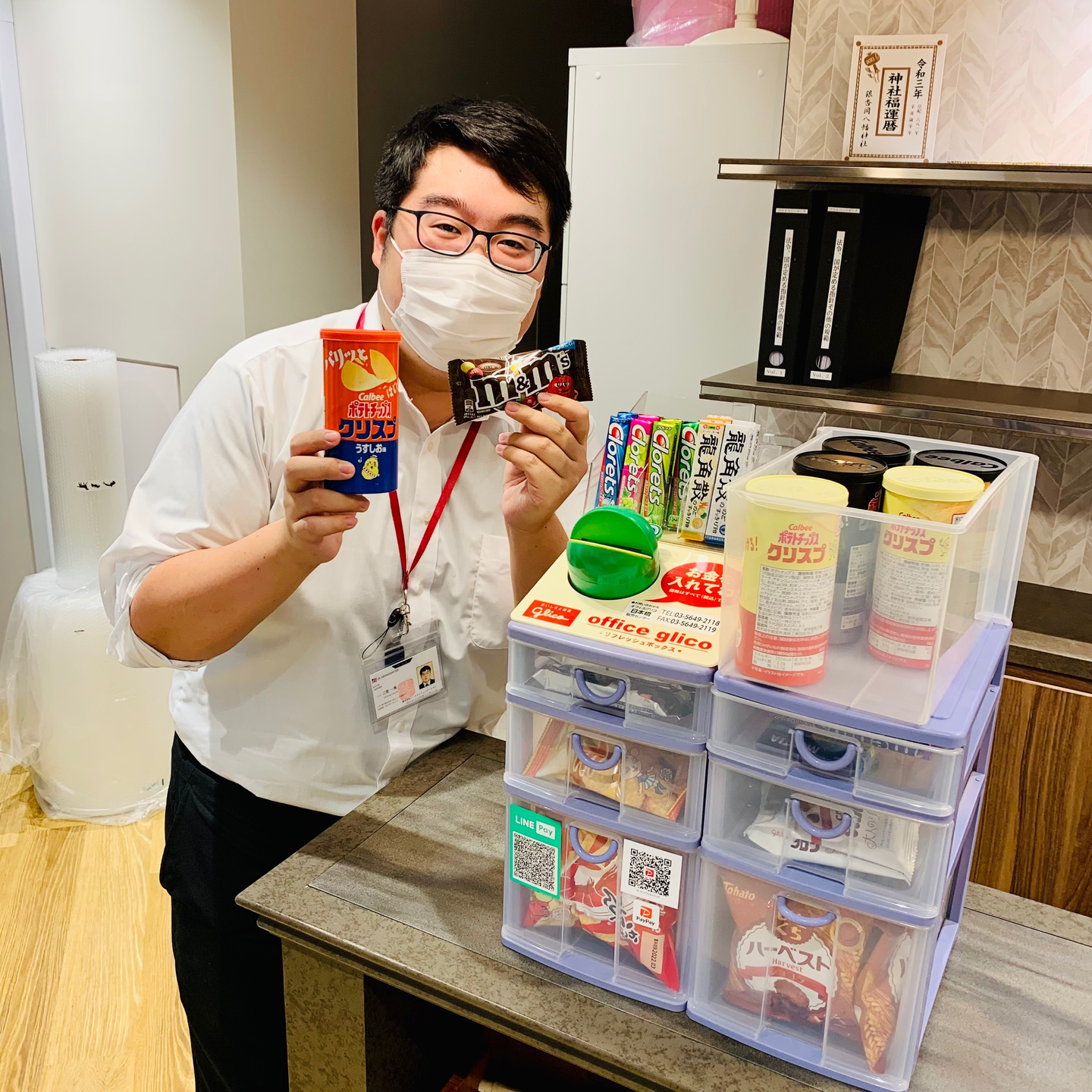 こちらは福利厚生の一環で置いている社内無人販売で、色んな種類のお菓子や飲み物を購入できるようになっているんです。