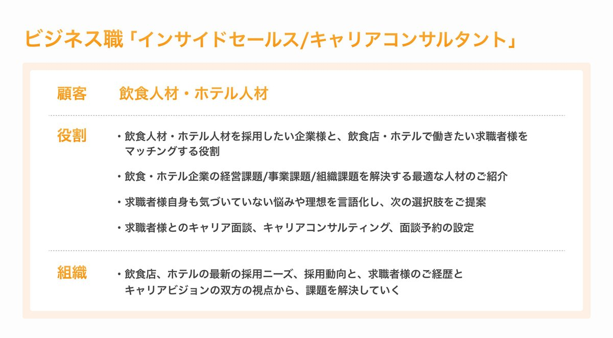 マネジメントは深くて面白い。ベンチャーならではで、若手から経験できて、本当に楽しい。 ベンチャー企業で早くから裁量を持って成長したい、年齢関係なく結果で評価されたい、2-3年目でマネジメントにチャレンジしたい、という方はぜひ一緒に、飲食・ホテル業界の採用課題を解決していきましょう!