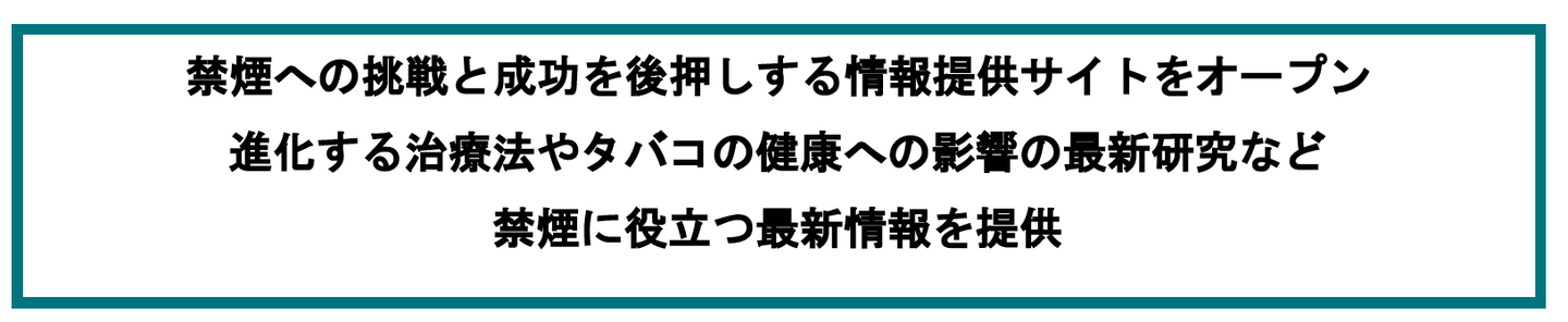 本サイトでは、このような最新禁煙治療の解説や、禁煙外来についての詳しい説明、たばこが健康に及ぼす正しい知識といった情報を掲載しています。今後も、禁煙に挑戦したいと思っている喫煙者の方々、周囲の方に禁煙を勧めたい方々に役立つ最新情報を提供し、より多くの方々の禁煙をサポートしてまいります。
