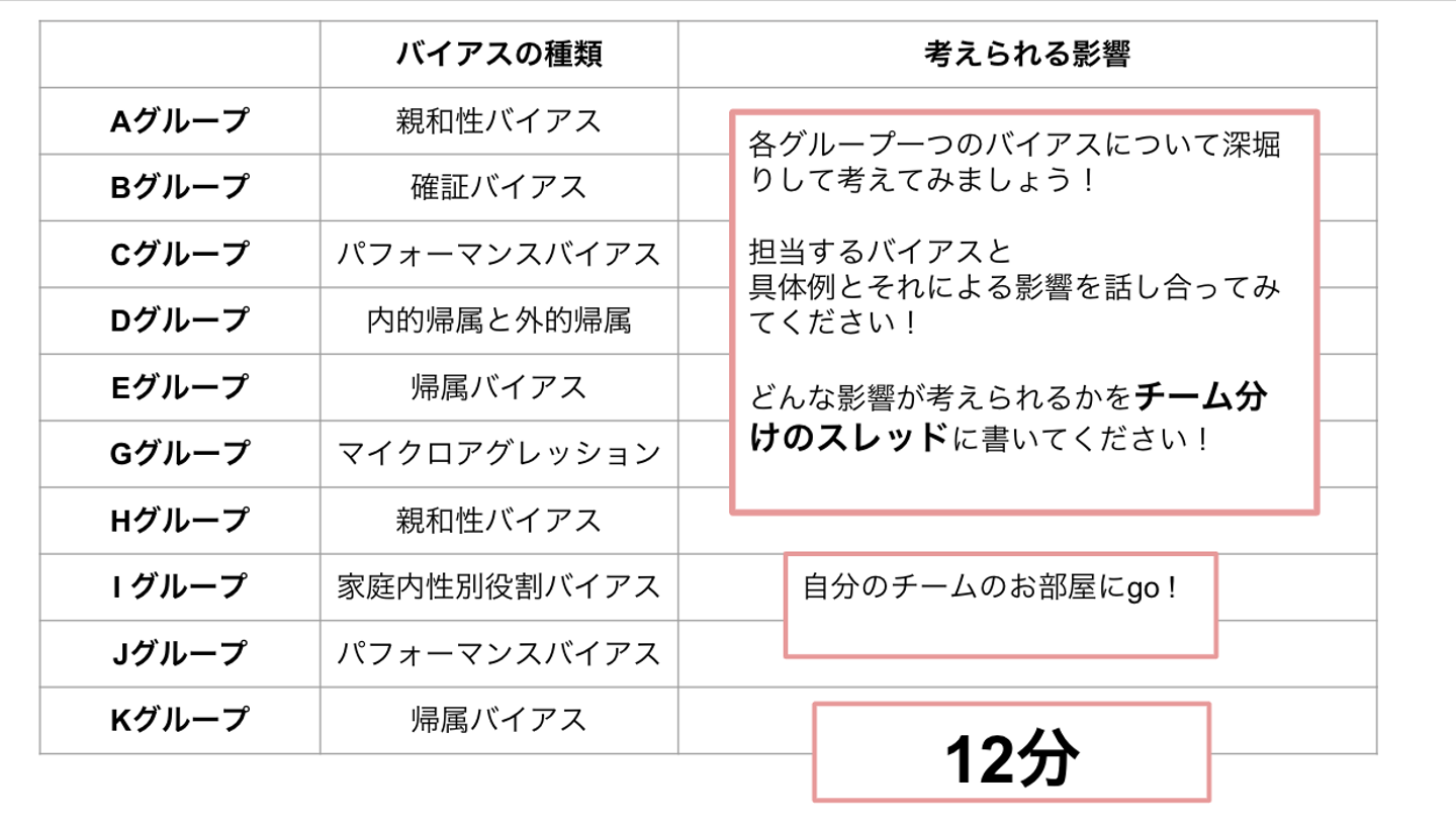 その後、部門を超えた少人数でのグループが作られ、親和性バイアス、確証バイアス、パフォーマンスバイアス、内的・外的帰属バイアス、マイクロアグレッション、家庭内性別役割バイアスなど多くの状況におけるバイアスについて熱い議論が行われました。ディスカッション後にはそれぞれそのバイアスによる影響について全体へ発表、共有する場も設けられ、より具体的な例により社員皆で理解を深めることができました。