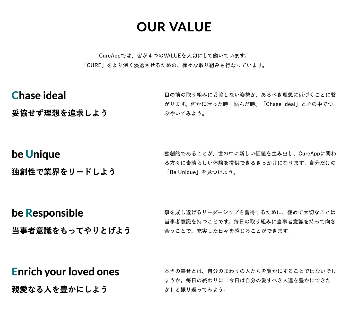(VALUEについての詳しい記事はこちら:https://www.wantedly.com/companies/cureapp/post_articles/295744)