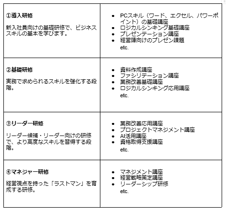 - 研修内容を常にブラッシュアップ:研修内容は固定ではなく、時流に合わせてブラッシュアップ。