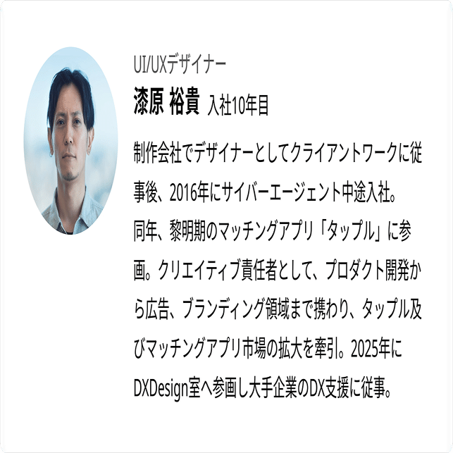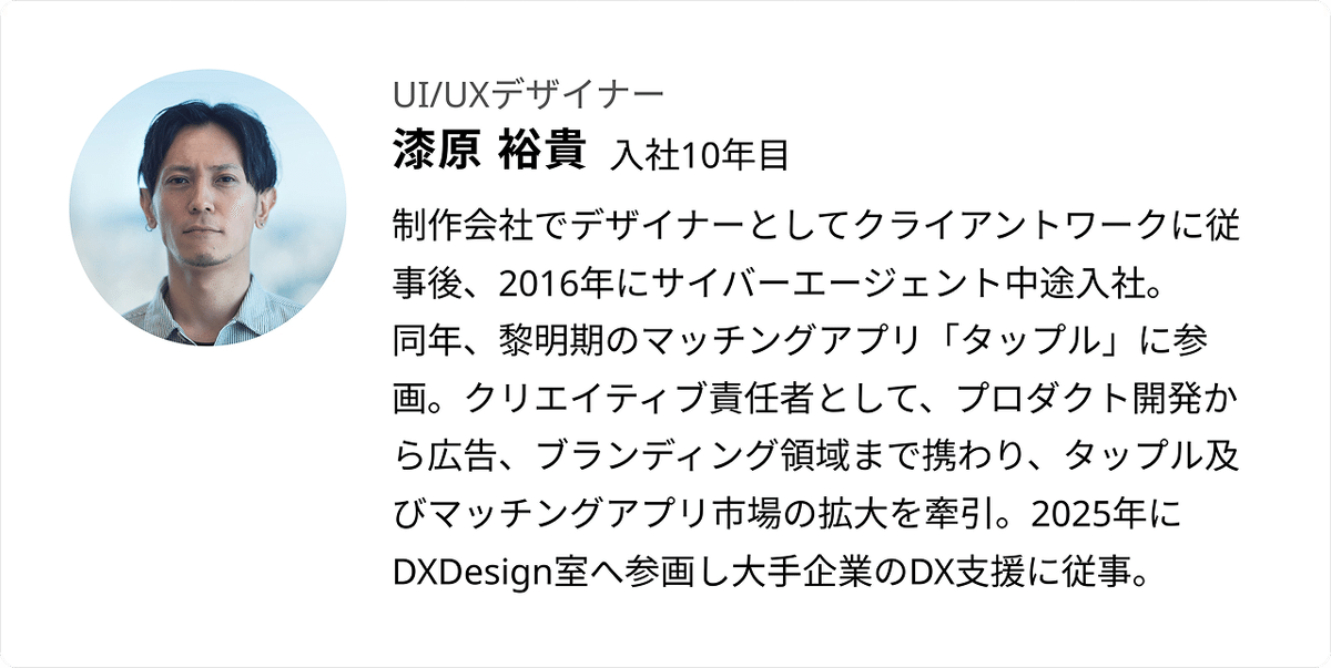 今回は、瀧田 凱斗さんがインタビュアーとなり、メディア事業部のタップルから2025年1月に異動されてきた漆原 裕貴さんに、DXDesign室へ異動を決めた背景や仕事のやりがい、挑戦してみたいことなどについてお話を伺いました。