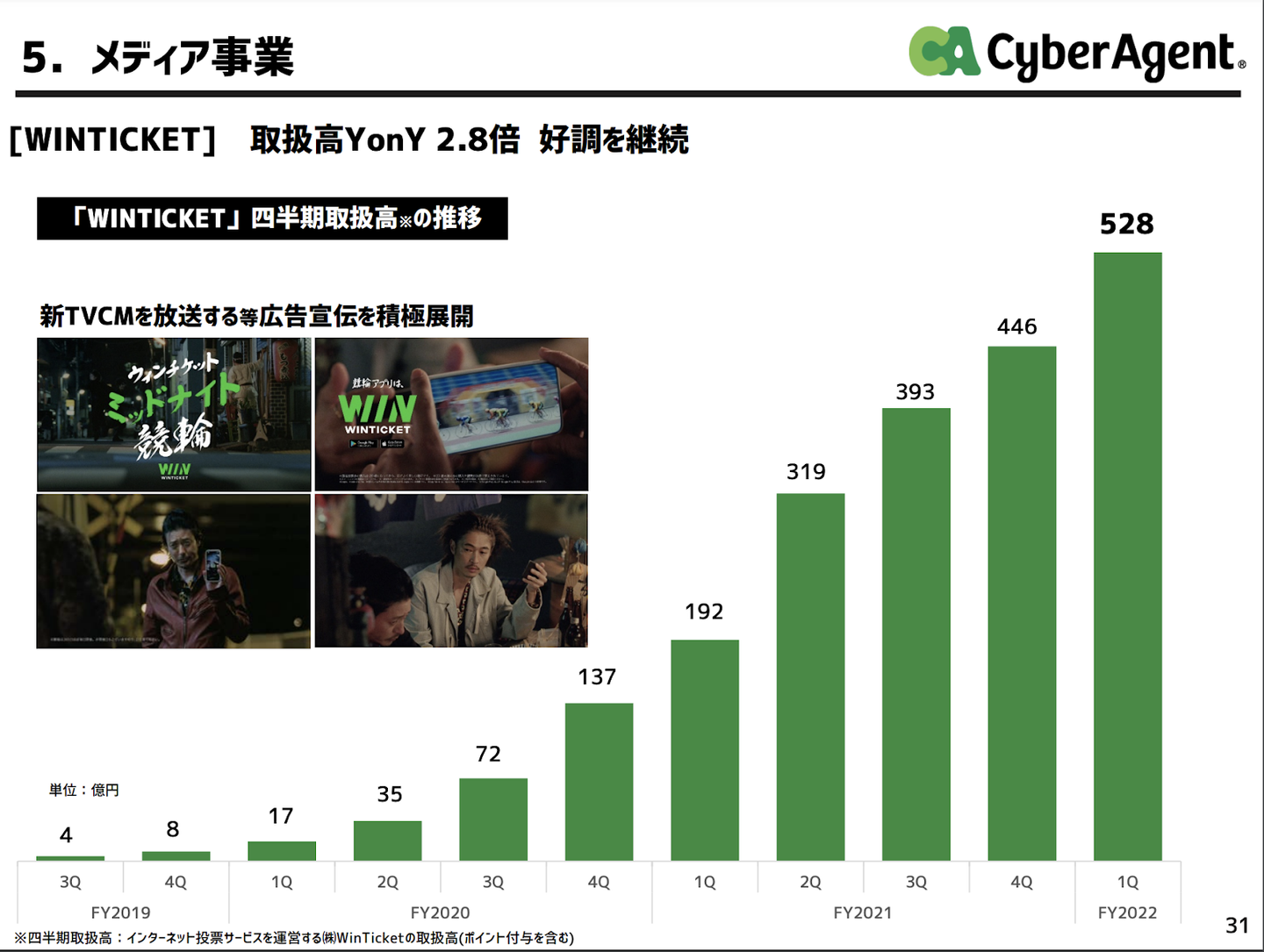 TVCMでも話題の「WINTICKET」はサイバーエージェントの子会社である株式会社WinTicketが提供する、競輪・オートレースなど公営競技のインターネット投票サービスです。先日の2022年1Q決算発表にもあった通り、2022年10-12月の取扱高は前年比2.8倍の528億円と急成長しています。
