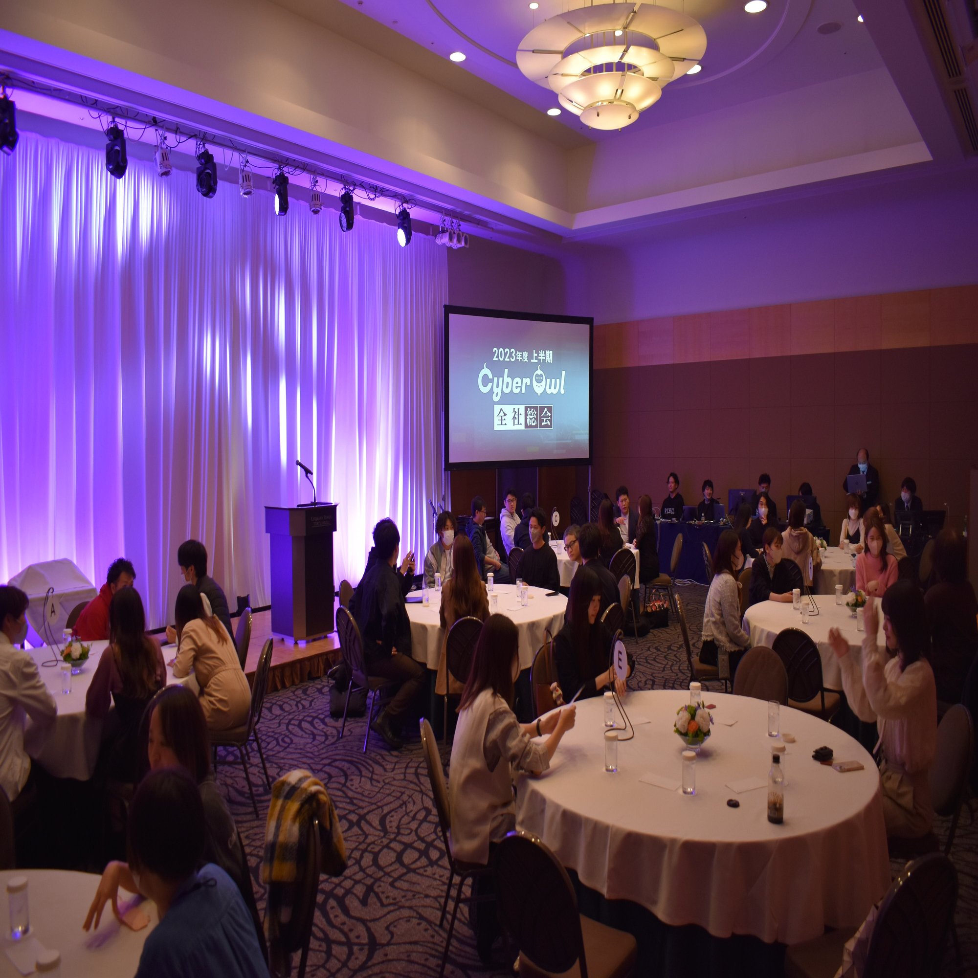 全社総会の会場内の様子 今回の総会は、社長による2023年度下半期に向けたビジョンプレゼンテーションとスローガンの発表、 ギルド のチーム発表、そして上半期を締め括る表彰式が行われました。
