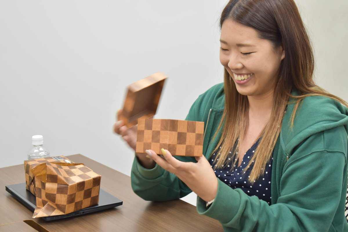 篠﨑:滋賀県民では知らない人はいないぐらい有名なんです。今回、取り寄せていただいたのは「バームクーヘンmini」。手のひらサイズで食べやすいですよね。定番のバームクーヘンはこのミニサイズ4つ分くらいの大きさで大きいんです。それと、滋賀県の子どもは皆このバームクーヘンが入ってる箱に折り紙を入れるの!