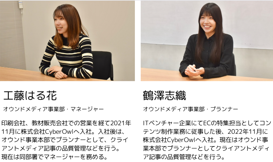 工藤:私は2021年の11月にサイバーアウルに入社し、現在3年目になります。以前は、印刷会社や教材の販売会社で営業をしていました。サイバーアウルに入社後は、オウンドメディア事業本部のプランナーとしてSEO記事の編集職に従事し、お取引先さまのオウンドメディアに掲載する記事を制作しています。