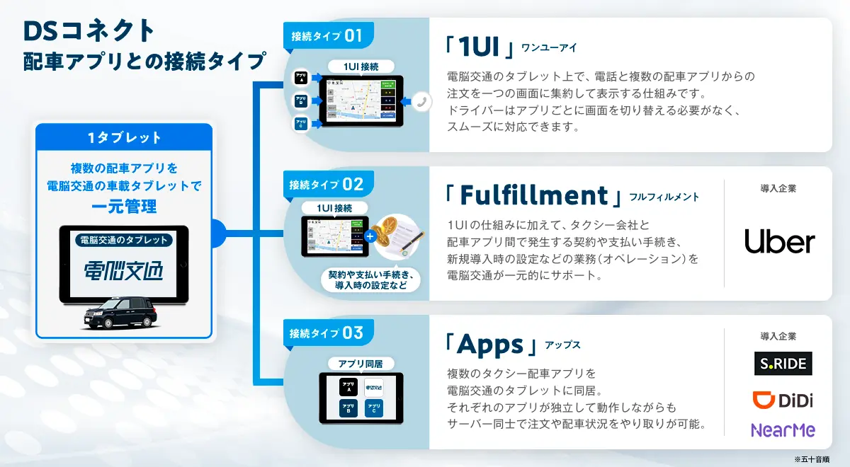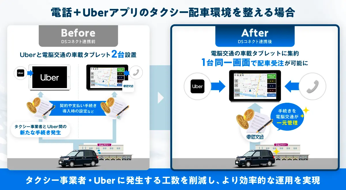 本連携では、全国47都道府県・約600社・約2万台のタクシー車両に導入されている電脳交通のクラウド型タクシー配車システム「DS」と、世界70カ国以上で展開されているUberアプリとのシステム連携が実現します。タクシー事業者は、電話およびUberアプリからのタクシーの配車依頼を、電脳交通の車載タブレット1台で同一画面にまとめて受けられるようになります。さらに、電脳交通がタクシー事業者とUberアプリ間で発生するオンボーディングや契約、支払いなどの手続きを一元管理することで、双方に発生する工数を削減し、より効率的な運用を実現します。