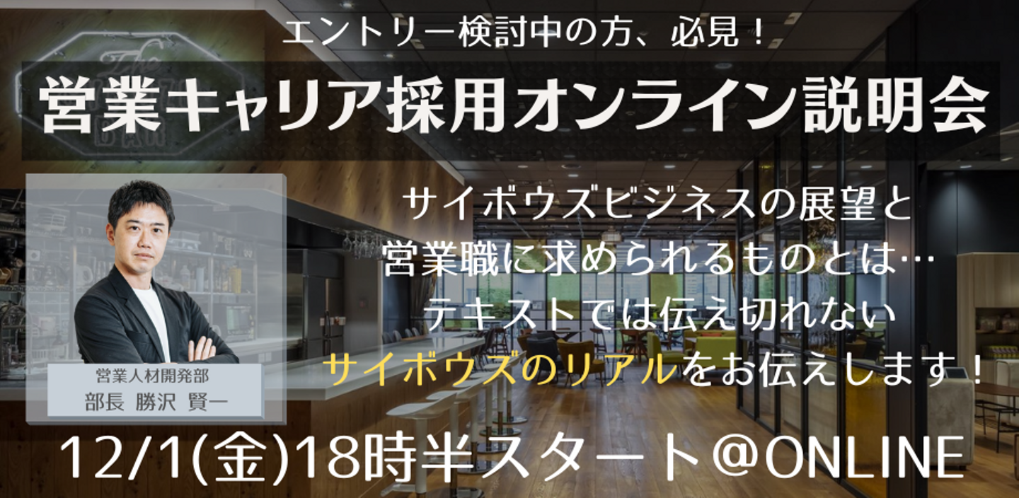サイボウズ営業に興味を持ってくださった方は、ぜひ 12月1日開催の営業キャリア採用オンライン説明会にご参加ください。お待ちしています。