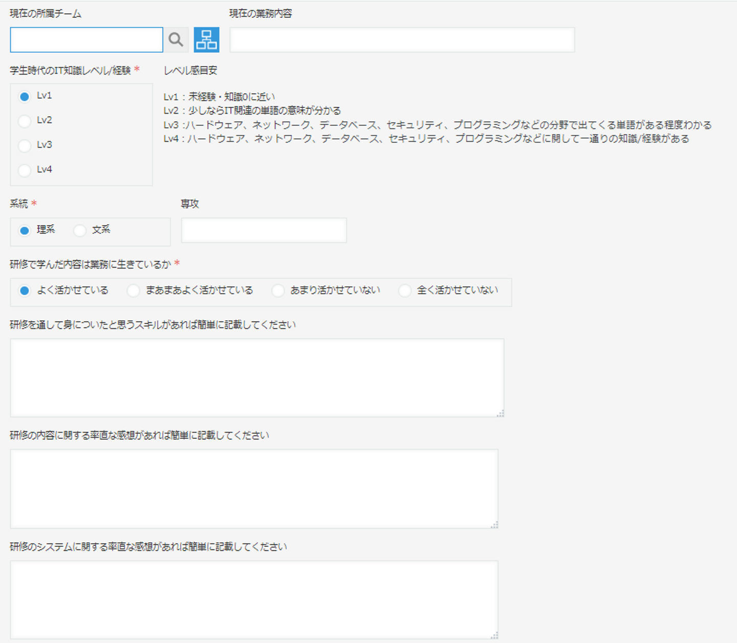 せっかくなので、この記事を執筆するにあたって 2023 年に新卒で SC 本部へと配属となったメンバーに学生時代に経験はあったか?研修はどうだった?といった内容のアンケートをとってみました。ちなみにアンケートは kintone で作成してみました。時間をかけずにサクッとアプリを作れるのはやっぱり便利ですね!