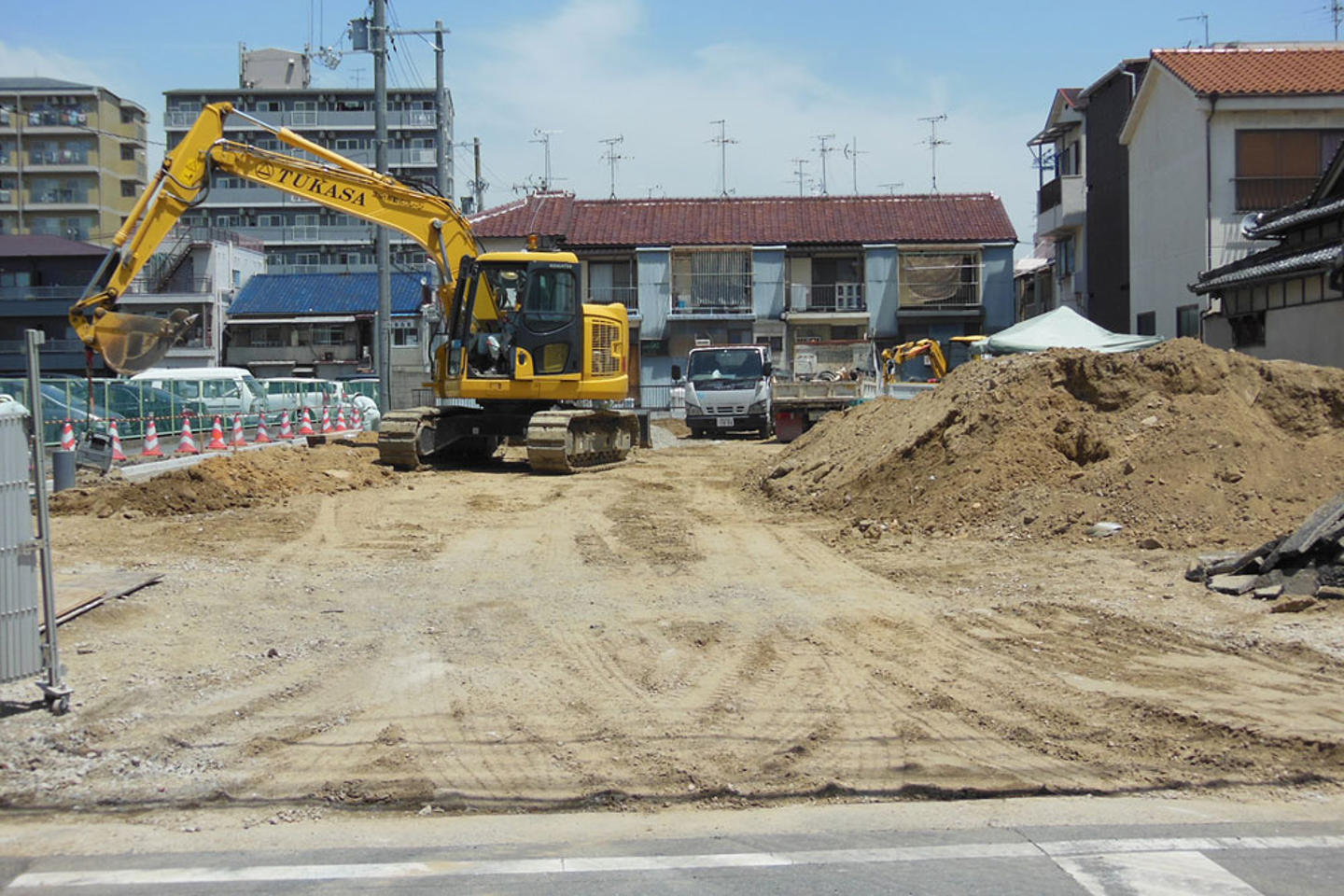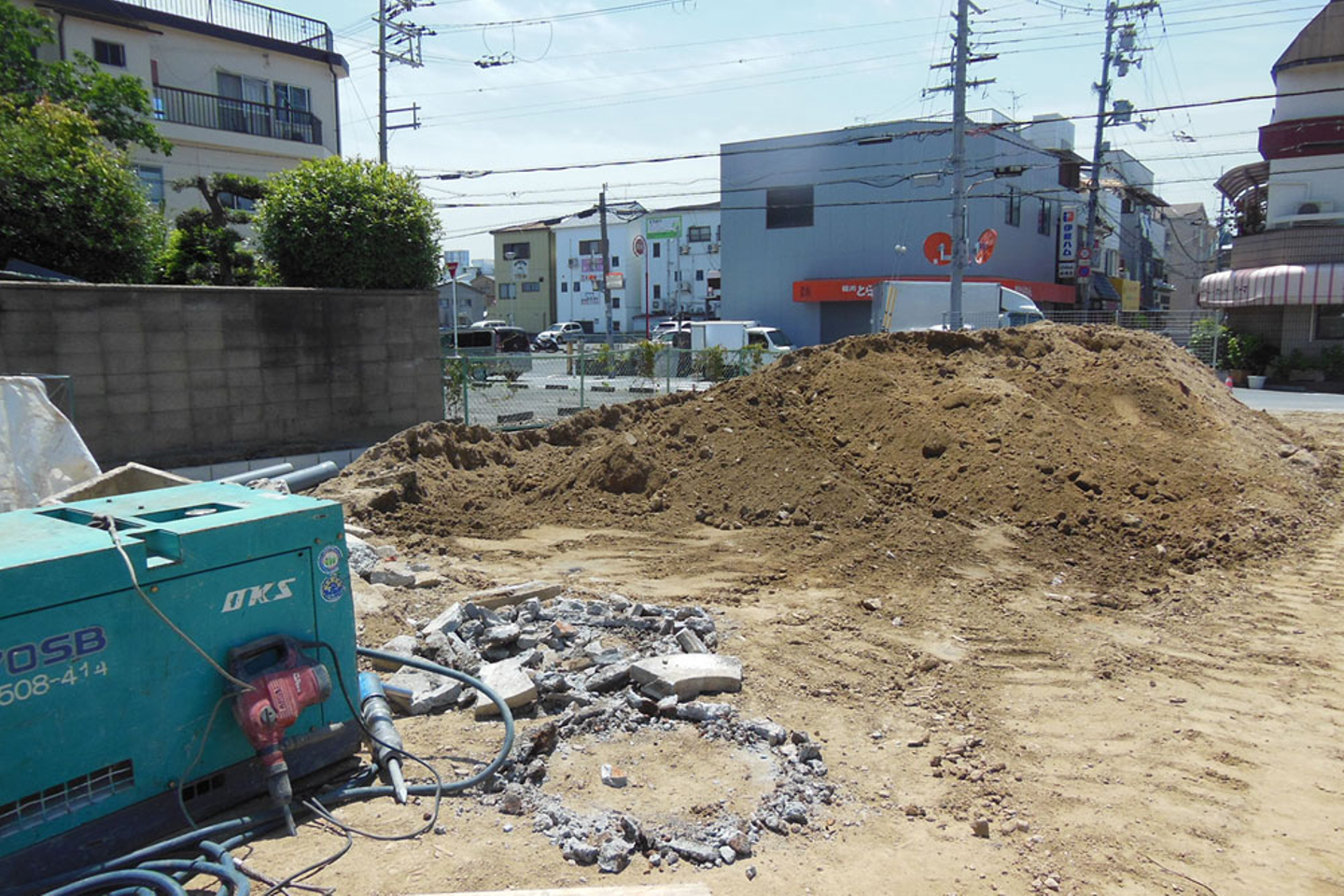 敷地内には什器が入り、掘り起こされた土やコンクリートが高く積みあがっていました。
