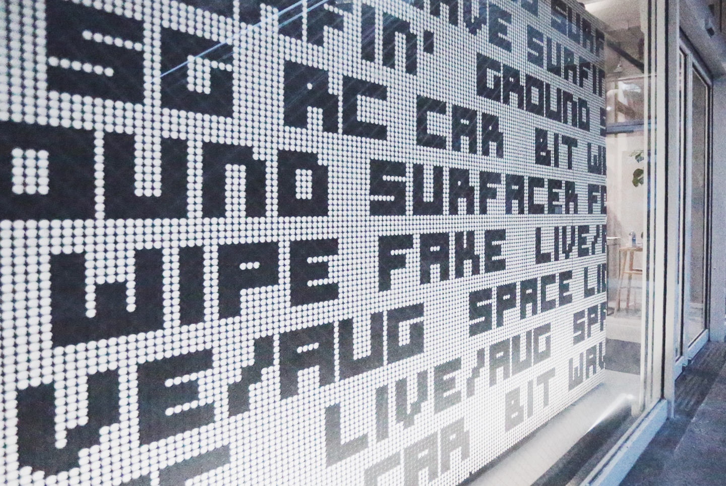 皆様を最初にエントランスでお迎えしたのが約2m×2m のFLIP-DOTSです。FLIP-DOTSとは、磁気で反転する複数のドットで構成されたアナログ感覚のディスプレイデバイス。複数のユニットで使用することで、一般的なディスプレイでは味わえない、音と視覚効果を作り出すことができます。