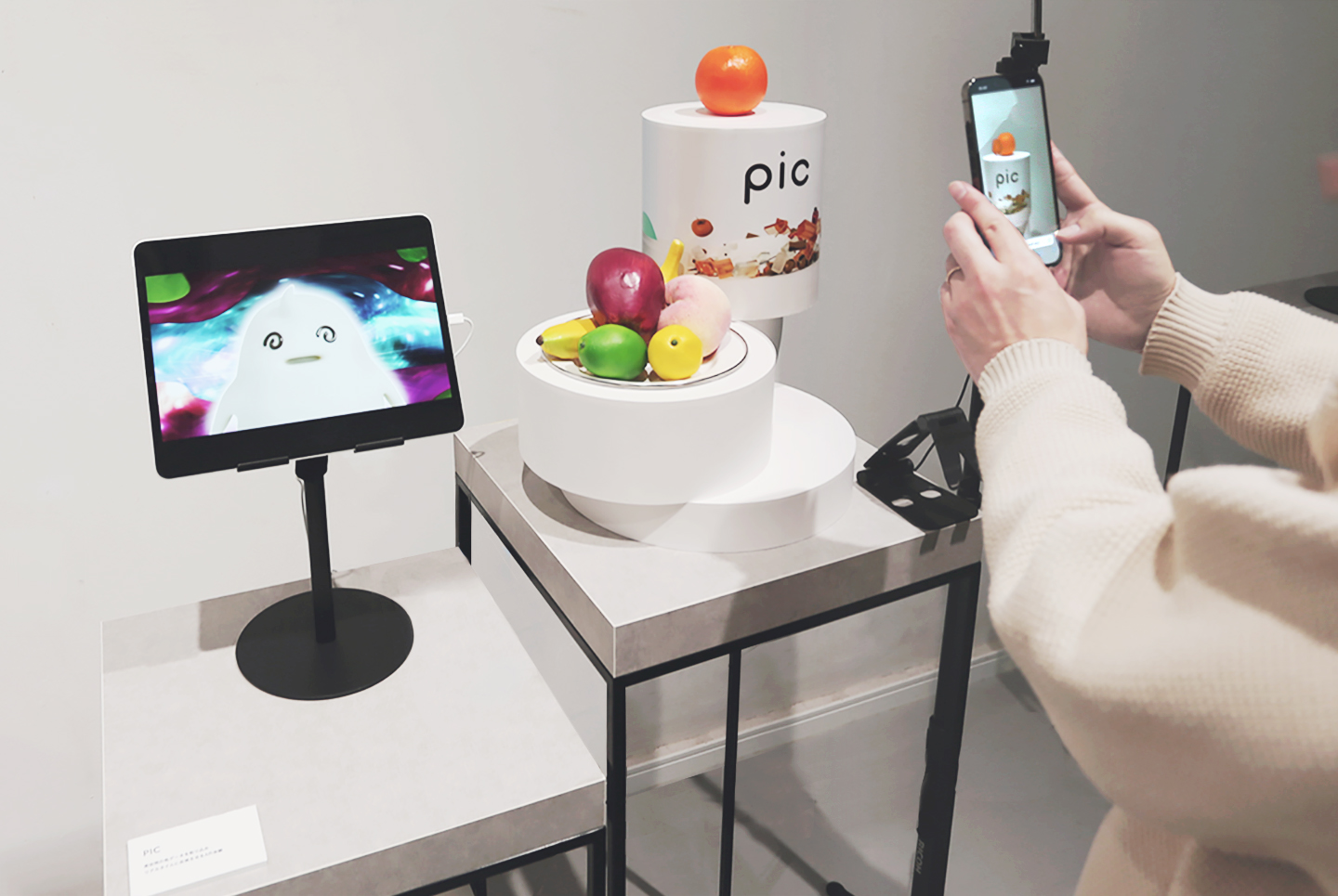 今回はAR上のバーチャルキャラクター「PIC」と、実空間に「PIC」のお皿のオブジェクトを用意し、そこに載せた果物の色に合わせて「PIC」の体の色が変化するという演出をお愉しみいただけます。スポイトで吸い取った物体の陰影も細かく読み取ることが可能。また専用のアプリは不要でWeb上でARを体験することができます。