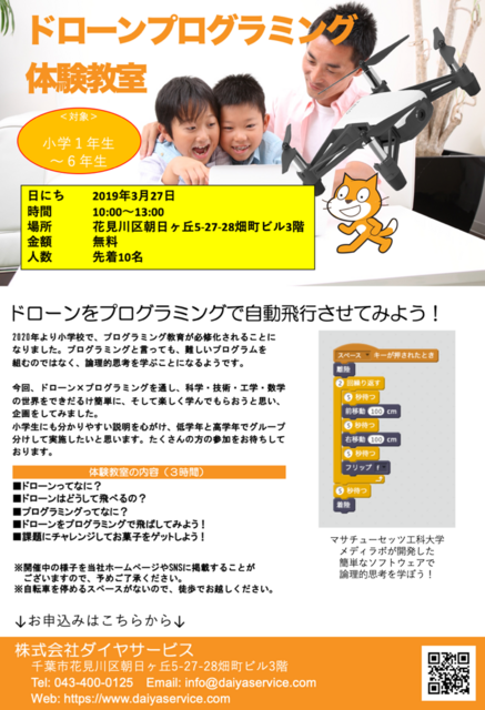 ドローンソリューションプロバイダの株式会社ダイヤサービス(本社:千葉県千葉市、代表取締役:戸出智祐)では、このたび、小学生向けにドローンを使用したプログラミングの体験教室を開催いたしますので、ご連絡いたします。