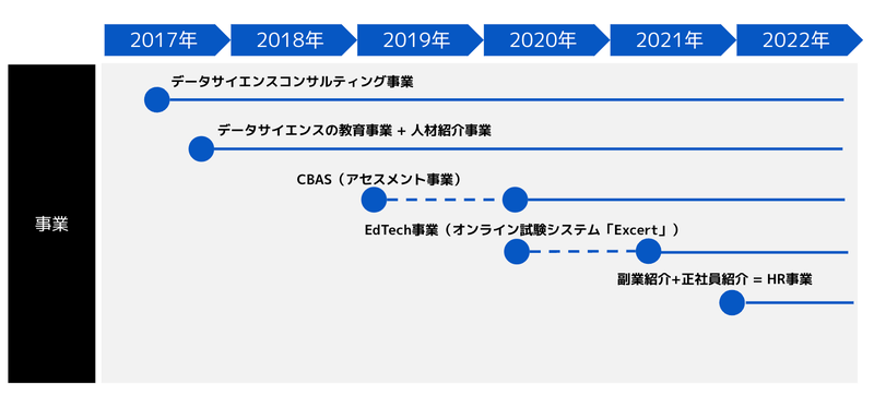 データサイエンスに関わるコンサルティング事業とデータサイエンス教育事業からスタートしました。その後、データ人材の正社員紹介、データ分析実務スキル検定、オンライン試験プラットフォーム「Excert」の運営と、データサイエンスをコアに事業をどんどん広げてきました。