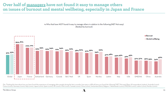 アデコグループが2021年に世界25カ国14,800人に調査した調査では、ウェルビーイングを社員のメンタルヘルスとして捉え、社員のメンタルウェルビーイング[7]が悪化し、働き手の約40%がバーンアウト(燃え尽き症候群)を懸念材料として挙げています。一方で、管理職の半数以上がバーンアウトやメンタルウェルビーイングに関して社員が問題を抱えているか見極めるのは容易ではないと回答しており、特に日本では80%を超える管理職が容易ではないと答えています。