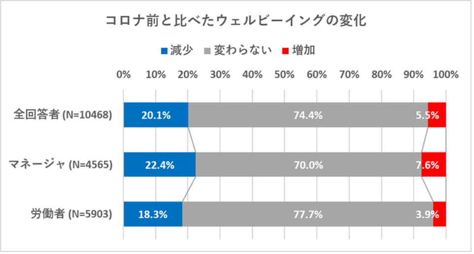 CSP2021によると、マネージャの方が(労働者と比べて)ウェルビーイングが減少した割合(22.4%)も、増加した割合(7.6%)も高いことが示されています。