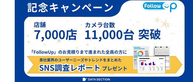 導入店舗7,000店舗、導入カメラ台数11,000台突破記念キャンペーン「SNS調査レポートをプレゼント」『FollowUP』の全世界に導入店舗7,000店舗、導入カメラ台数11,000台突破を記念し、『FollowUP』をお見積りまで進まれた方に、貴社業界のSNS調査レポートをプレゼントするキャンペーンを実施いたします。当社はデータ分析ソリューション事業において、SNS分析やデータ販売を行っています。そこで今回特別に、小売業界ごとのSNS調査レポートをプレゼントする運びとなりました。【プレゼント対象者】お見積りまで進まれた方全員【プレゼント内容】貴社業界のユーザーニーズやトレンドがまと...
