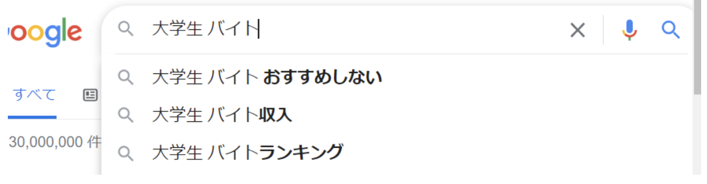 そこで「大学生 バイト」と調べると、サジェストに「大学生 バイト おすすめしない」と出てきて、びっくりしました。