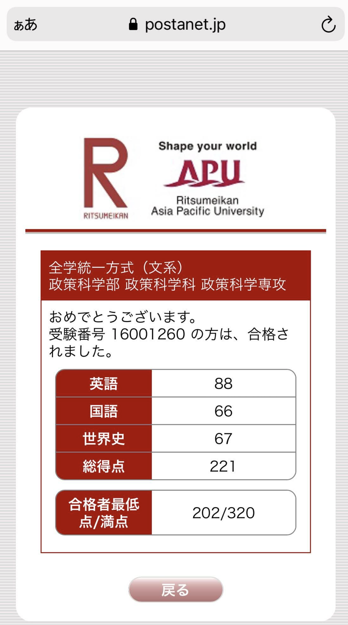 立命館大学に合格したときの写真