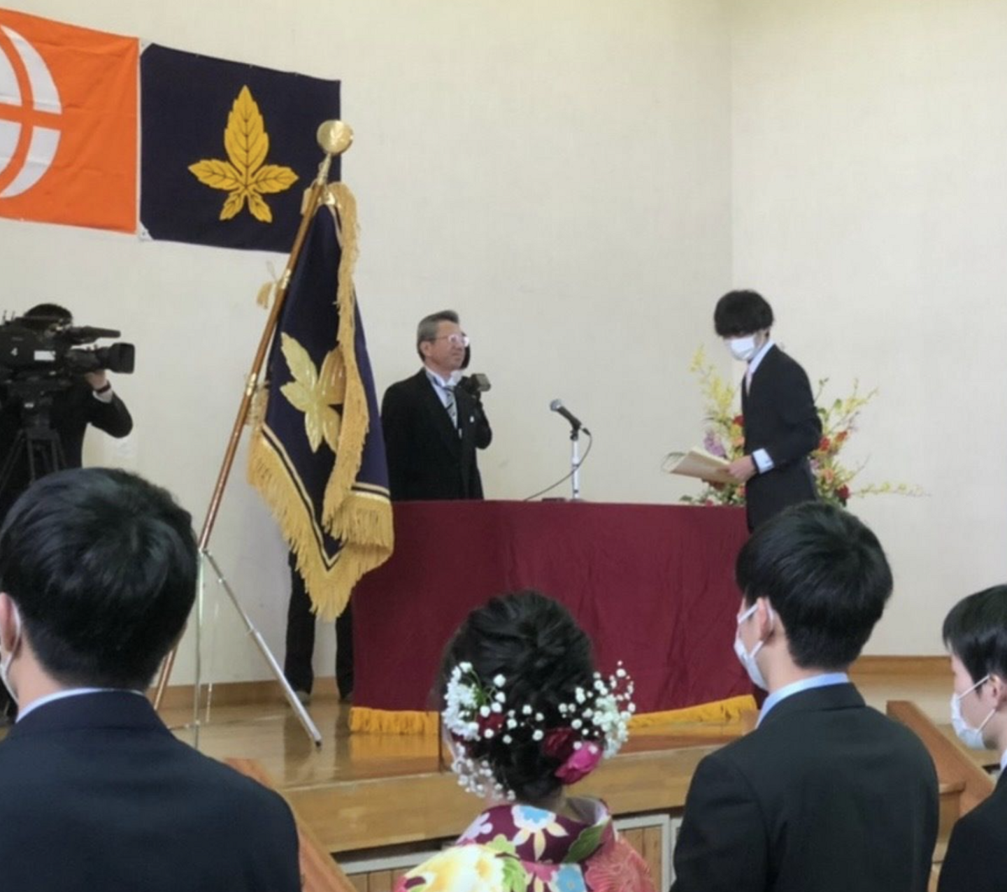 卒業式の生徒代表として学年分の証書を受け取る様子