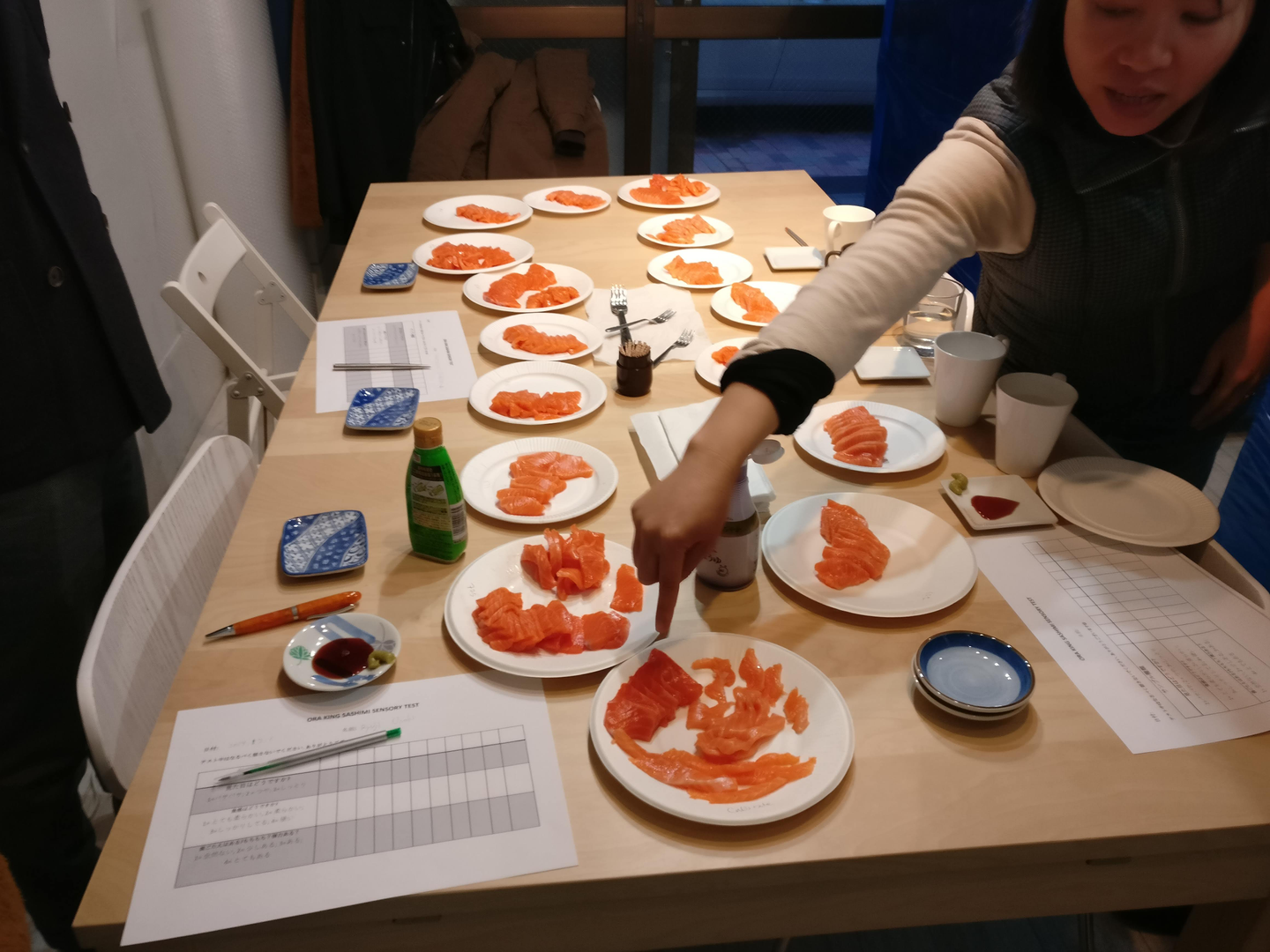 サーモンもアワビ同じように、ニュージーランドで最大手のサーモン養殖会社から空輸で大量のサーモンが届き、冷凍テストを実施した案件です。今回は解凍した生の状態での品質比較で、一般的な冷凍機と3種類の特殊急速冷凍機×4種類の解凍方法(自然解凍、流水解凍、冷蔵解凍、電子レンジ解凍)で、計16パターンのサーモンのお刺身が並び、それをひたすらブラインドテスト(試食)。美味しかったですし、真剣に評価させていただきましたが、あんなに大量のサーモンを食べたのは初めてでしたね。1年分以上の量は食べたんじゃないでしょうか。
