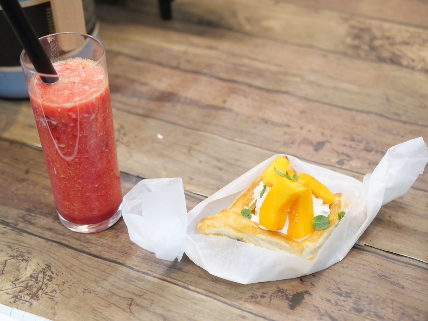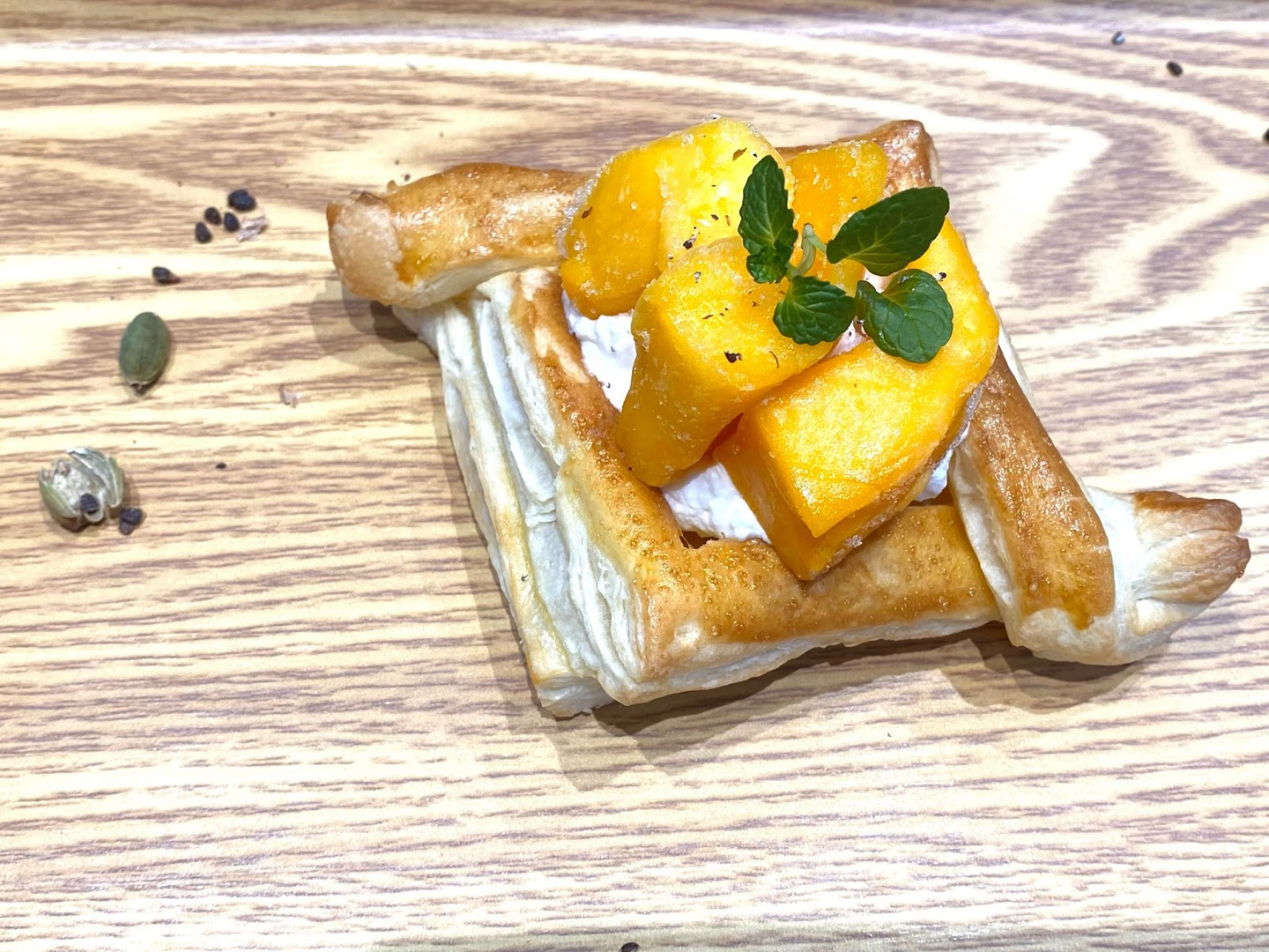 そんなマンゴーを使ったマンゴーパイを食べると、マンゴーの甘さとクリームの甘さ、さらにサクサクのパイも合わさって口の中が幸せになりました☺️