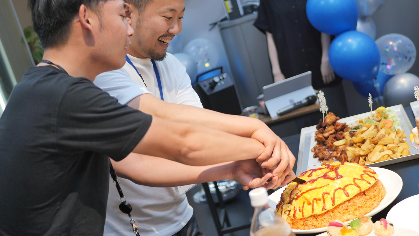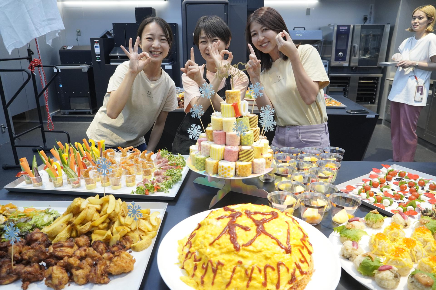 調理研究を担当するラボチームのメンバーに協力してもらって、パーティーケーキのようなオムライスを準備しました。