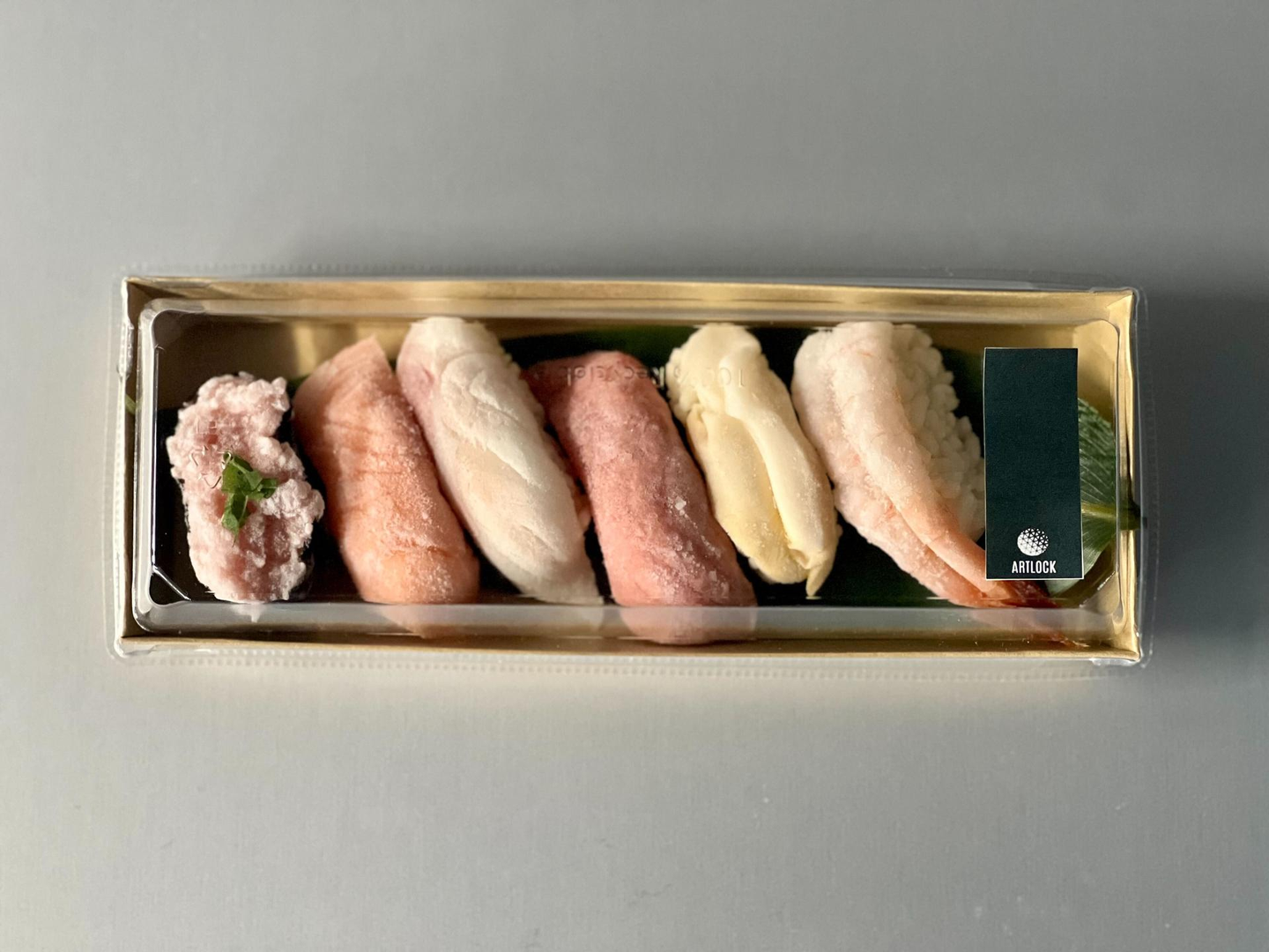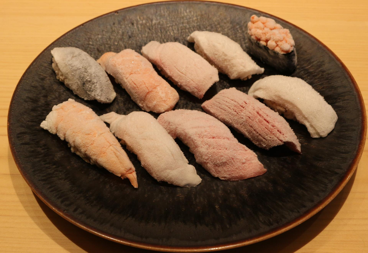 - 「鮨 銀座おのでら 江戸前冷凍鮨」(上:解凍、右:冷凍)