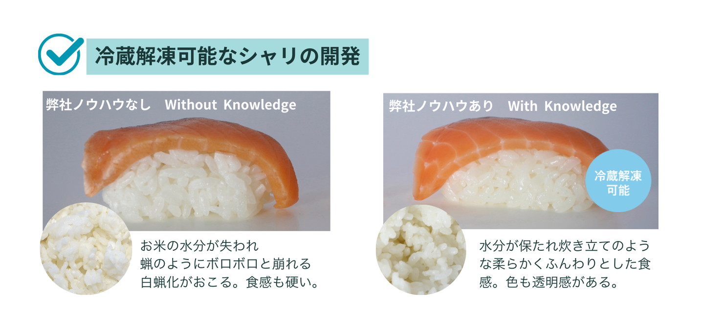 解凍した時に握りたての寿司を再現するため、冷凍寿司専用にシャリのレシピを研究。パサつきや白蝋化(※)を防ぐ最適な調味料や水分の配合を追求し、冷凍解凍後もお米のふっくらとした食感と適度な粘りを維持するシャリの開発に成功しました。